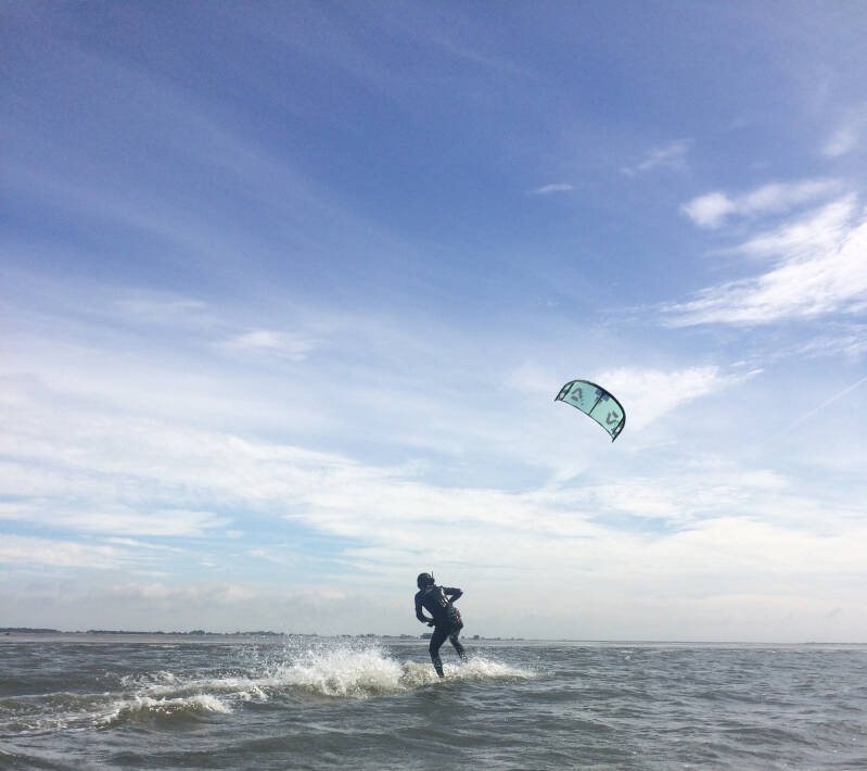 ...man kann auch in Sankt Peter Ording mal Glück haben und den Spot im Sommer ganz für sich allein haben. In diesem Fall war es so das die Vorhersage nicht richtig passte und nachmittags Wind aufkam obwohl nichts angesagt war. Ich rief also schnell Jan an und sagte ihm wo wir uns treffen. Knapp eine halbe Stunde später waren wir auf dem Wasser und gingen nochmal alles durch. Dann steuerte Jan den Kite nach unten, stand auf und fuhr seine ersten 200m auf dem Kiteboard. Ich sagte ihm über das Funkgerät wann er wieder steuern muss um nicht unterzugehen und es klappte einfach sensationell. Jan war überglücklich und ich auch. Es ist einfach ein tolles Gefühl wenn man sich zum ersten Mal aus dem Wasser ziehen lässt und dann losfährt.Ein toller Tag mit tollen Bedingungen.